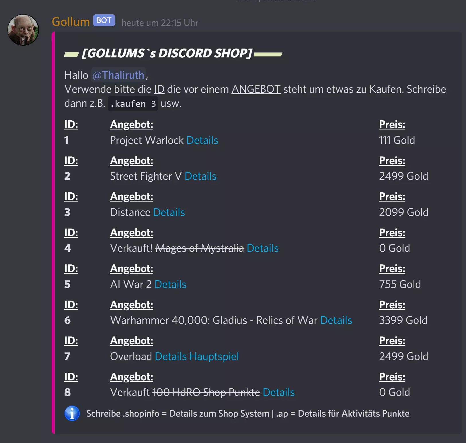 Mit dem Gold könnt ihr in meinem programmierten Discord Shop Game Keys für Steam oder HdRO Shop Punkte kaufen. Auf dem rechten Bild sieht ihr eine Übersicht der aktuellen Shopangebote. Für diese Spiele oder HdRO Shop Punkte bekommt ihr entsprechend einen Steam Key oder einen Key für die Shoppunkte, um dies Ingame in Herr der Ringe Online einzuösen.