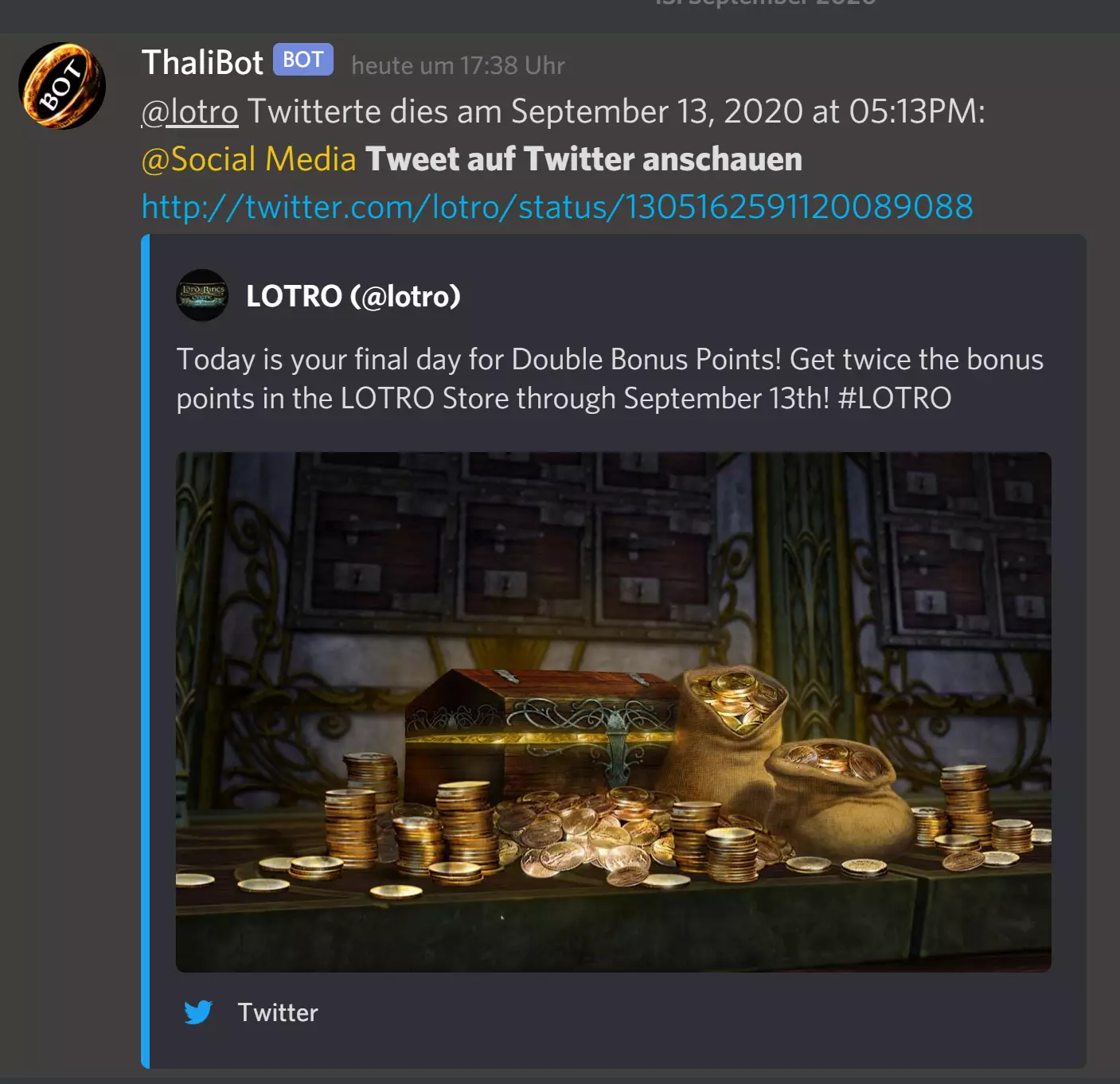 Dieser HdRO Discord Server ist einzigartig durch meinen Discord Bot Gollum! Diesen gibt es nur ein Mal und das bei mir! Dieser wird von mir entwickelt und stets verbessert mit neuen Funktionen. Daher ist dieser HdRO Community Disacord Server mit seinen umfangreichen Funktionen einzigartig. Das, was Gollum kann, da er speziell für die Community und HdRO programmiert wurde, kann euch keiner der unzähligen öffentlichen Discord Bots bieten, zudem sind dies meistens eh nur Datenkraken. Und andere Server sind mit zig solcher Bots geflutet.