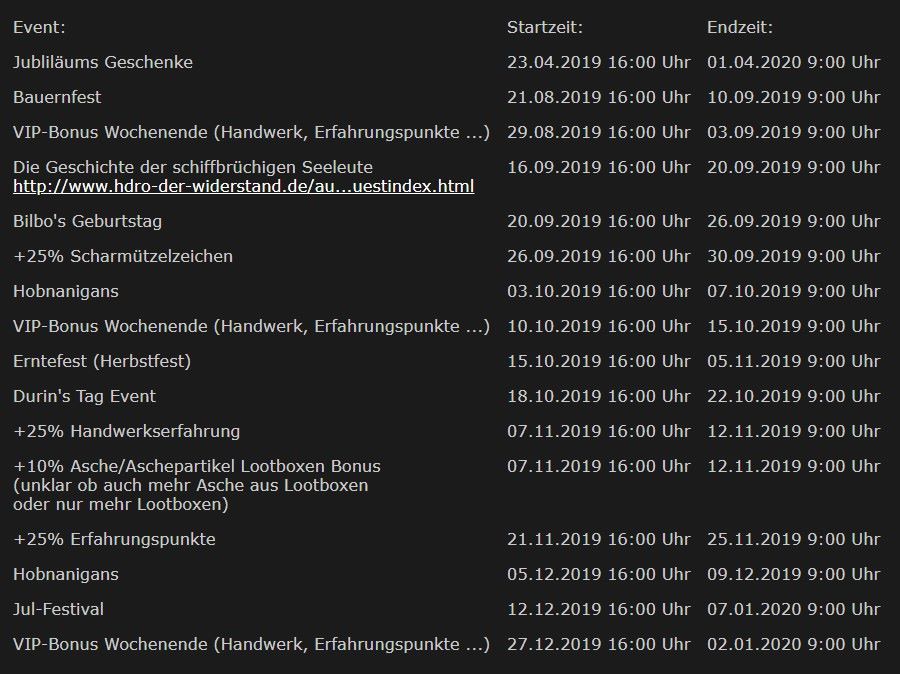 Hier einmal eine Übersicht der kommenden Ingame Events in der Herr der Ringe Online. Bedacht bitte das diese Liste noch nicht Vollständig ist, unter anderem fehlt hier noch das Bauernfest. Die Offizielle Liste der Events 202 findest du hier