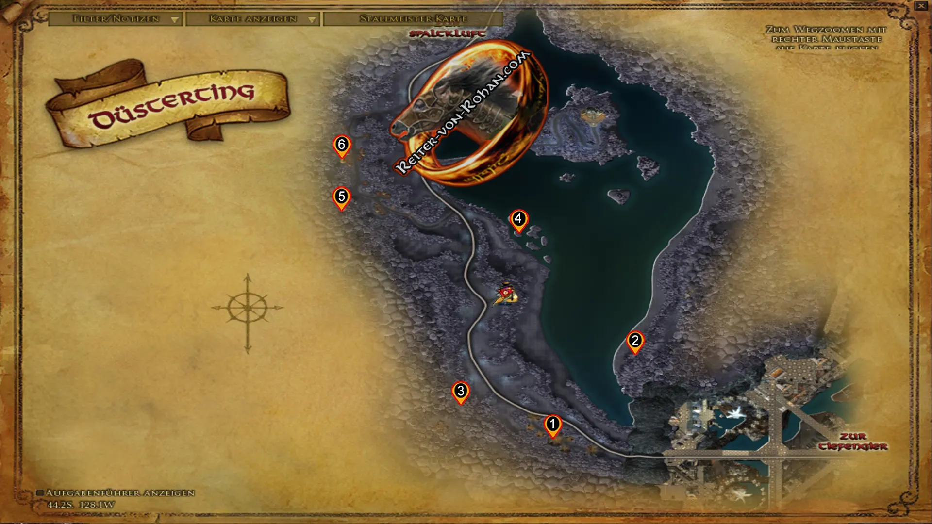 Die Markierungen auf der Karte zeigen den ungefähren Bereich des Fundortes an und müssen daher nicht immer zu 100 % richtig sein! Zudem kann es untrer Umständen sein, dass du dir das Gebiet / Questpack im HdRO Shop kaufen musst, um die Taten zu erhalten / vervollständigen.Damit du die von mir oben genannten Koordinaten leichter zu finden kannst, empfehle ich dir Folgendes Plugin - Way Point