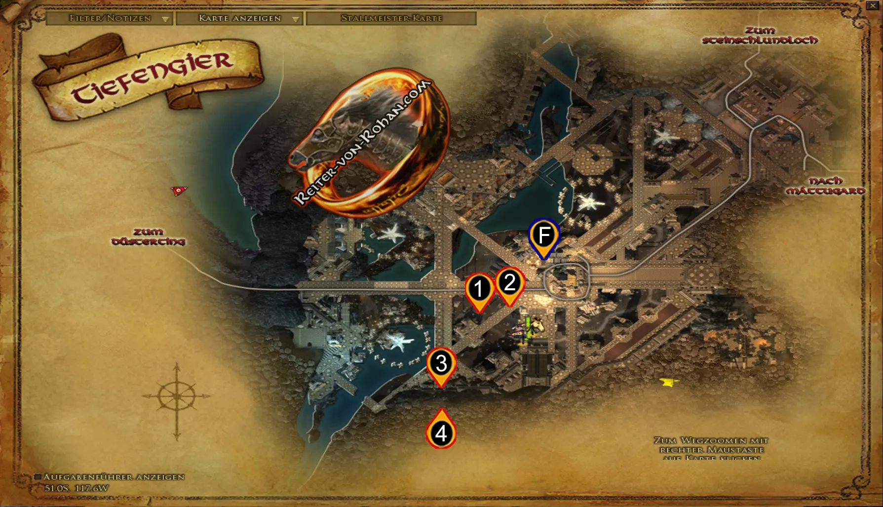 Die Markierungen auf der Karte zeigen den ungefähren Bereich des Fundortes an und müssen daher nicht immer zu 100 % richtig sein! Zudem kann es untrer Umständen sein, dass du dir das Gebiet / Questpack im HdRO Shop kaufen musst, um die Taten zu erhalten / vervollständigen.Damit du die von mir oben genannten Koordinaten leichter zu finden kannst, empfehle ich dir Folgendes Plugin - Way Point