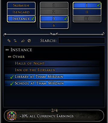 Der Screenshot oben zeigt beispielsweise einen Spieler, der an einer skalierbaren Instanz für 3 Leute interessiert ist. Davon gibt es nur 4 und dieser Spieler hat „Bibliothek in Tham Mírdain“ und „Die Schule in Tham Mírdain“ ausgewählt. Da die Größe „6“ nicht ausgewählt ist, werden keine der 6-Mann-Instanzen angezeigt.
