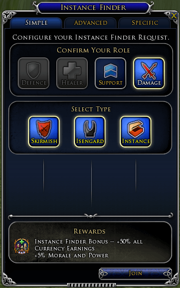 Auf der Registerkarte „Spezifisch“ könnt ihr die entsprechende Instanz für eure derzeitige Gruppe starten. Bei Update 6 werdet ihr mit dem Instanzen-Finder keine Gruppe für diese Instanzen finden können, doch dies ist ebenfalls etwas, um das wir uns hoffentlich in späteren Updates kümmern werden.