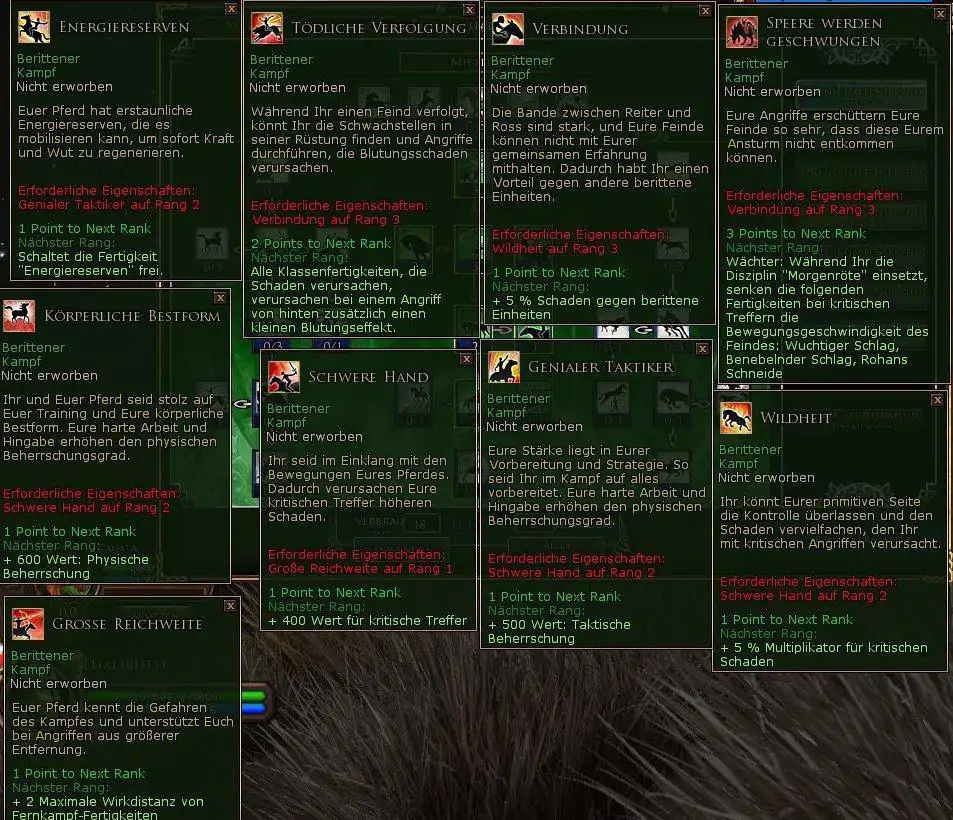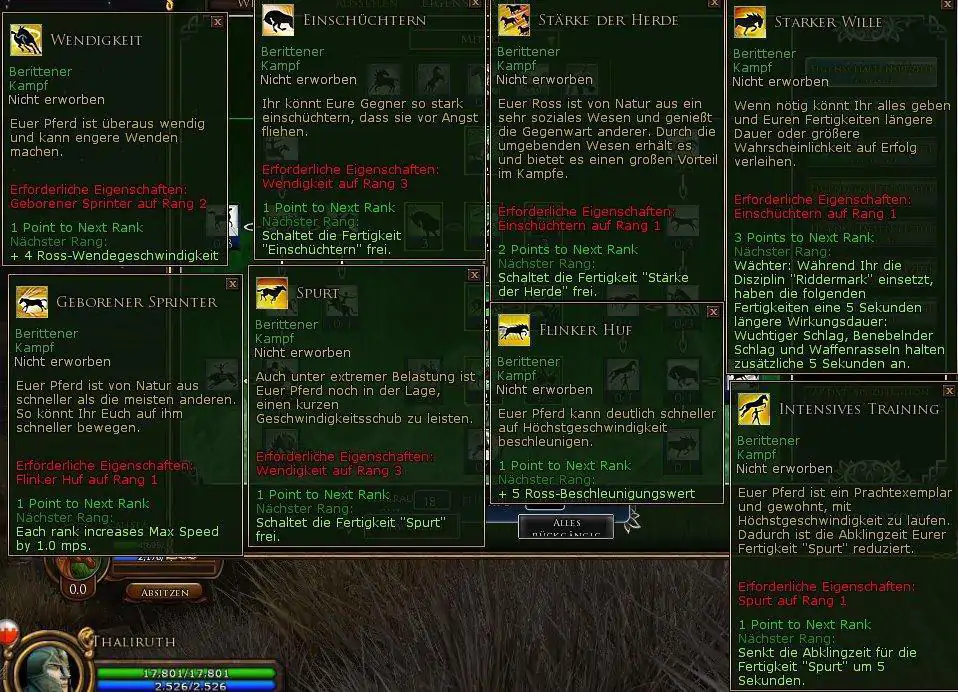 Unten siehst du nun einmal 3 verschiedene Skillbäume bzw. Traitlinien. Es ist ähnlich wie bei den Klasseneigenschaftsbäumen aufgebaut. Da die Systeme recht verwand sind und sich daher auch nicht so besonders Unterscheiden. Du siehst nun einmal den grünen, roten und gelben Skillbaum denn du bei deinem Kriegsross Auswählern kann.