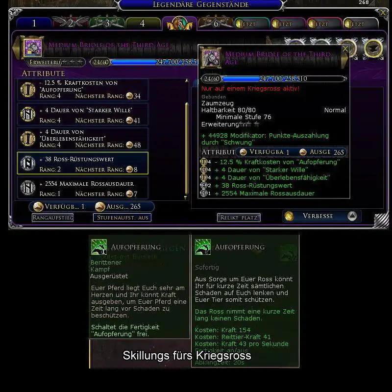 Aber letztendlich muss jeder für sich wissen, welchen Baum er nun wählt, ob nun leicht, mittel oder schwer. Jedes Mal, wenn euer Kriegsross ein Level aufsteigt, bekommt ihr Punkte, diese könnt ihr dann im Skillbaum bei leicht, mittel oder schwer zu Ordnen. Ihr könnt auch jederzeit die Punkte ohne Kosten zurückerstatten lassen, um diese z. B. auf ein Schweres Kriegsross zu legen. Wenn ihr auf euer Kriegsross auf sattelt, ändert sich auch eure Skillleiste. Es wird euch dann eine Neue angezeigt, wo die Skillungen für das Kriegsross enthalten sind, und die Standard Skills die ihr auf dem Kriegsross nicht nutzen könnt, werden ausgeblendet.